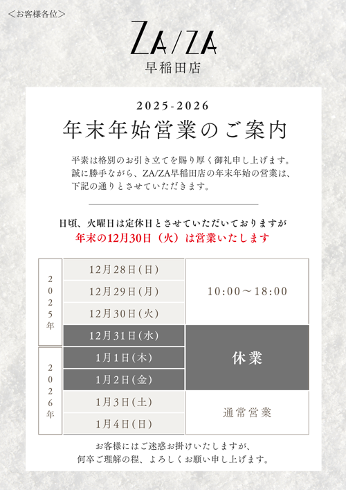 【重要】ZA/ZA早稲田店 年末年始営業のご案内 <2025-2026>